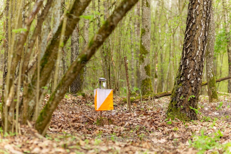 Ориентирование. Пункт управления Призма и электрокомпостер для ориентирования в весеннем лесу. Навигационное оборудование. Концепт