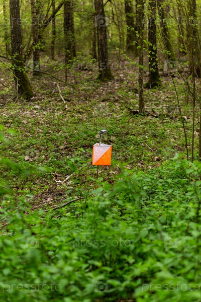 Ориентирование. Пункт управления Призма и электрокомпостер для ориентирования в весеннем лесу. Навигационное оборудование. Концепт