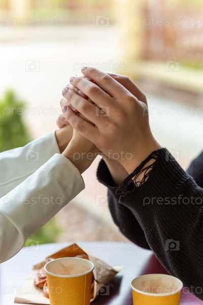 Пара наслаждается кофе, держась за руки. Держась за руки, руки пары, которая любит друг друга. Концепция портретной фотографии с боке