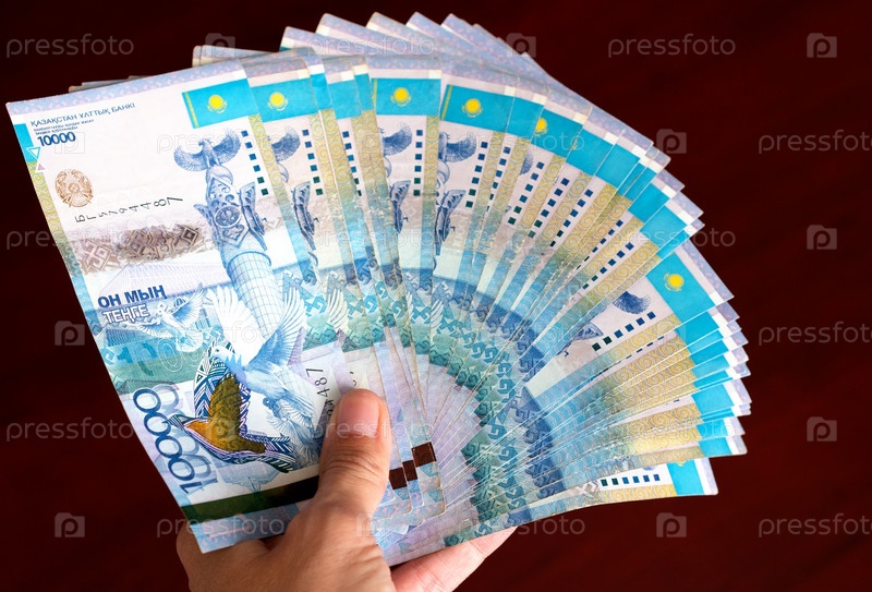 Тенге. Бумажные казахские деньги и калькулятор на столе крупным планом