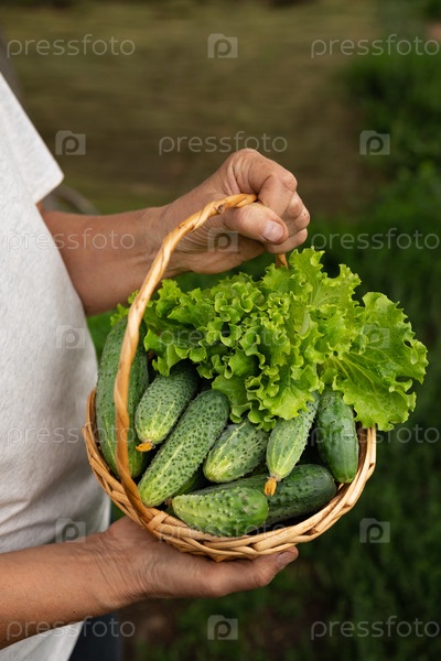 Крупным планом взрослый мужчина-фермер держит корзину со свежесобранными на данный момент овощами, довольными своим урожаем