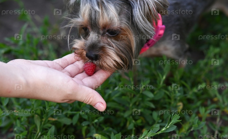 Портрет собаки йоркширского терьера в помещении, хозяин касается его головы