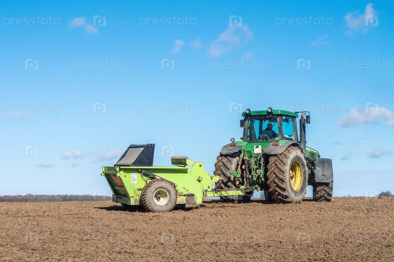 Калининград, Россия - 2021, 4 апреля: Весенняя вспашка. Сельскохозяйственные работы на полях. Трактор пашет землю. Удобрение почвы
