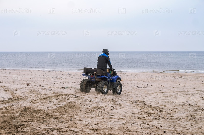 Квадроциклы на морском пляже. Катание на квадрицикле. Мужчина едет на квадрицикле по песку