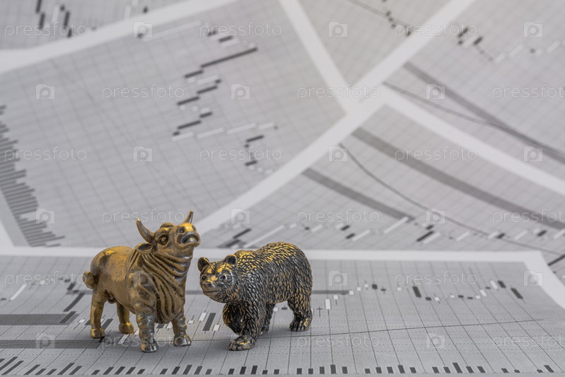 Металлические желтые бычьи и медвежьи фигуры на фоне графиков цен на акции. Биржевые торговые символы. Концепция борьбы покупателей и продавцов на валютном рынке и рынке ценных бумаг