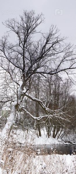 Большое дерево с раскидистыми ветками на крутом заснеженном берегу склонившееся над рекой. Зимний пейзаж.Цветное изображение. Вертикальный кадр