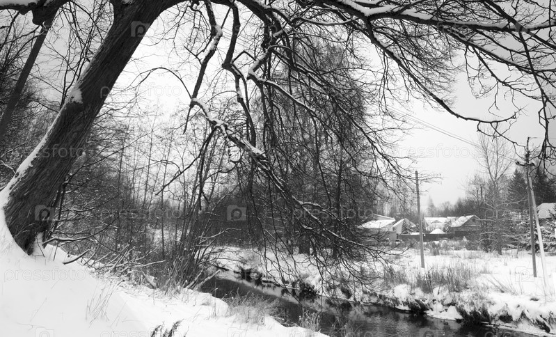 Большое дерево с раскидистыми ветками на крутом заснеженном берегу склонившееся над рекой на фоне деревни. Зимний пейзаж.Черно белое изображение. Горизонтальный кадр