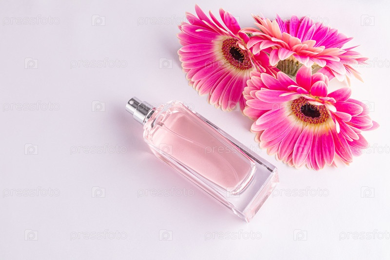 Стеклянный флакон розовых духов на белом атласном фоне с цветами гербер. Концепция натуральных цветочных ароматов. вид сверху. Копировальное пространство