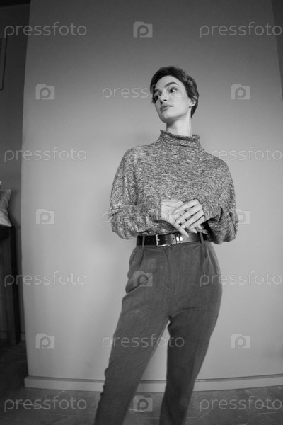 Молодая красивая женщина позирует в сером свитере в студии