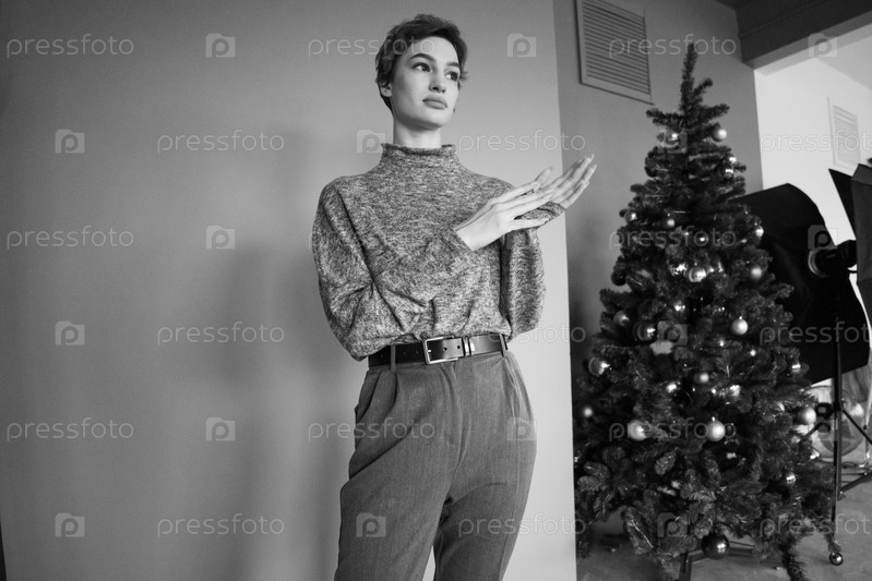 Молодая красивая женщина позирует в сером свитере в студии