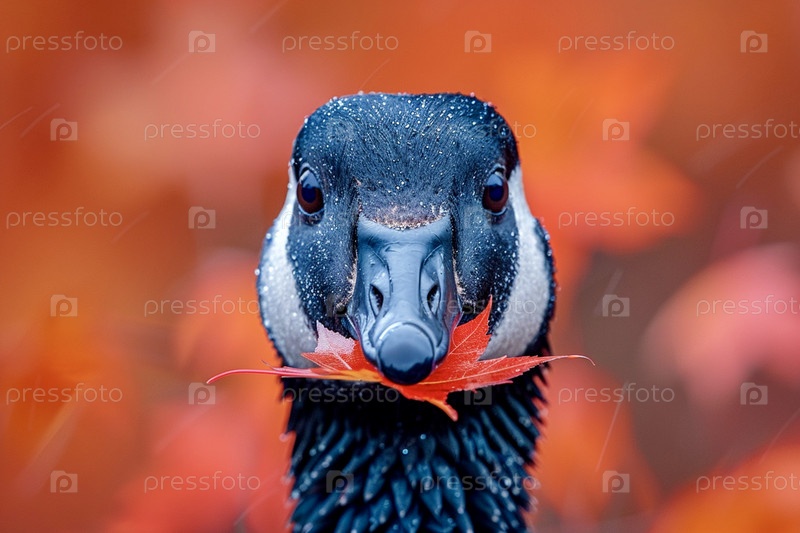 Канадский гусь держит в клюве красный кленовый лист, крупный план, выборочный фокус