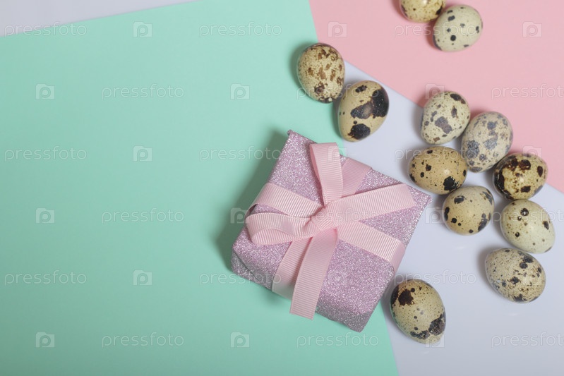 Перепелиные яйца лежат на белой поверхности. Рядом коробка с подарком, завернутая в упаковочную бумагу и перевязанная ленточкой. Листы цветной бумаги для фона