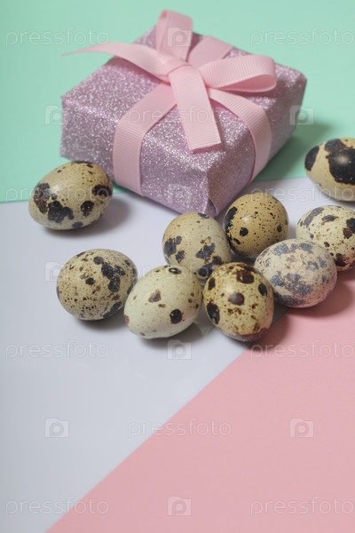 Перепелиные яйца лежат на белой поверхности. Рядом коробка с подарком, завернутая в упаковочную бумагу и перевязанная ленточкой. Листы цветной бумаги для фона
