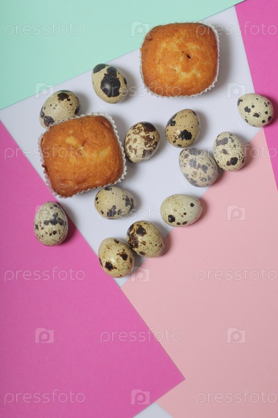 Перепелиные яйца лежат на белой поверхности. Рядом лежат кексы. Листы цветной бумаги для фона