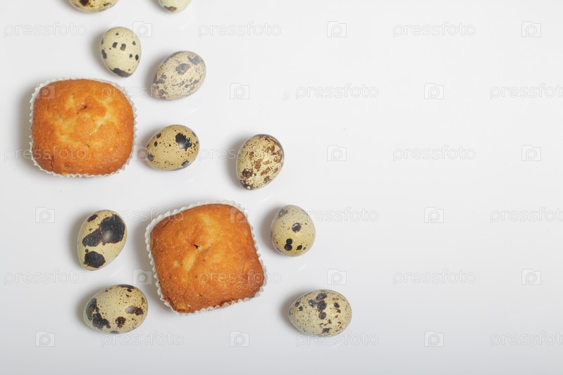 Перепелиные яйца лежат на белой поверхности. Рядом лежат кексы. Рядом коробка с подарком, завернутая в упаковочную бумагу и перевязанная ленточкой