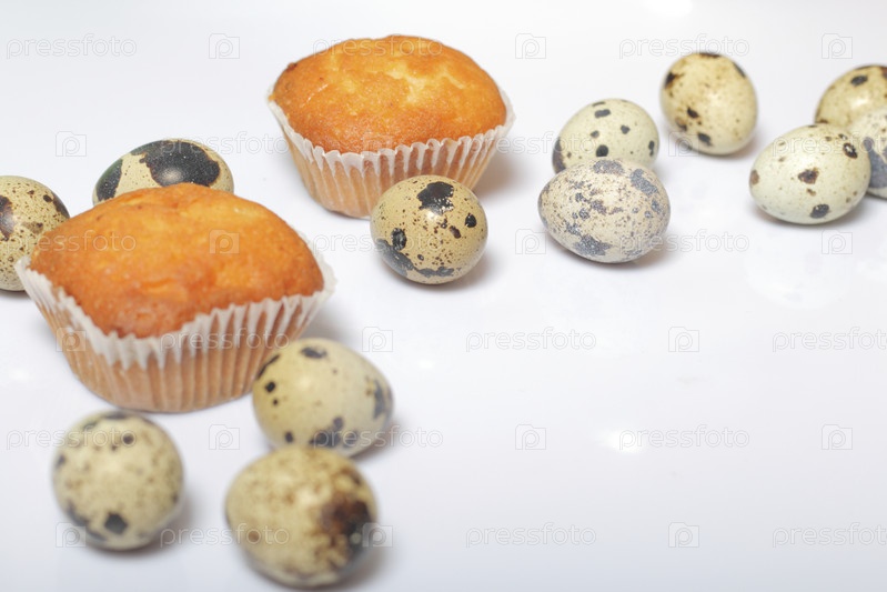 Перепелиные яйца лежат на белой поверхности. Рядом лежат кексы. Рядом коробка с подарком, завернутая в упаковочную бумагу и перевязанная ленточкой