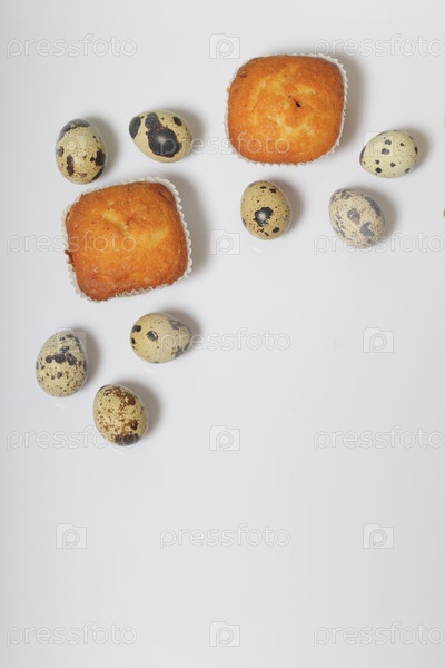 Перепелиные яйца лежат на белой поверхности. Рядом лежат кексы. Рядом коробка с подарком, завернутая в упаковочную бумагу и перевязанная ленточкой