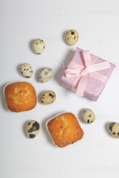 Перепелиные яйца лежат на белой поверхности. Рядом лежат кексы. Рядом коробка с подарком, завернутая в упаковочную бумагу и перевязанная ленточкой