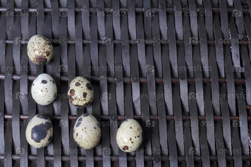 Перепелиные яйца лежат на поверхности плетеной лозы. На темном фоне