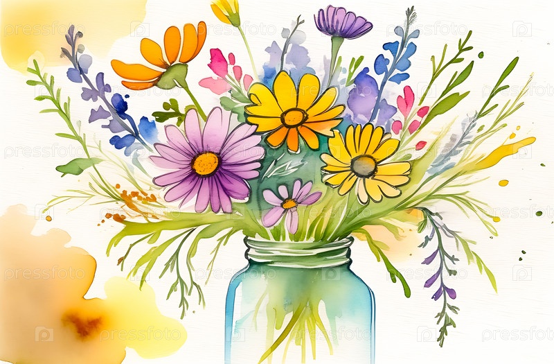 Акварельный рисунок букета полевых цветов в стеклянной банке