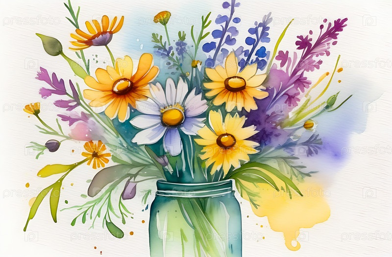 Акварельный рисунок букета полевых цветов в стеклянной банке