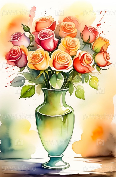 Акварельный рисунок букета роз в вазе на столе