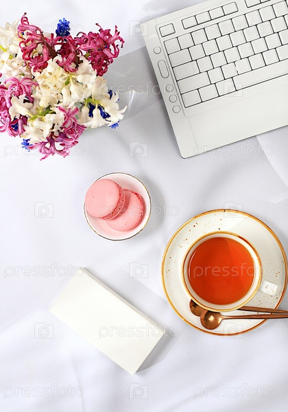 Современный женский стол, домашний офис. Компьютер, цветы гиацинта и чашка чая, миндальное печенье на солнечном столе с длинными тенями, концепция образа жизни, удобная работа на дому, шаблон для дизайна, плоская планировка, место для текста