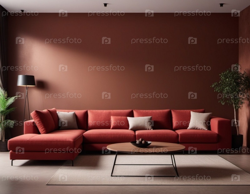 Дизайн гостиной в стиле лофт. Красный модульный угловой диван на фоне коричневой штукатурки стены с местом для копирования. Лофт дизайн интерьера современной гостиной, дома. Бежевый ковер. Боковое окно без штор