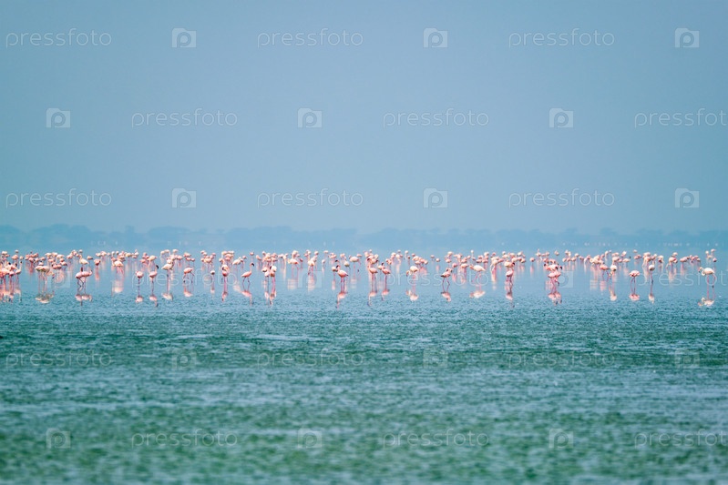 Розовые фламинго гуляют по соленому озеру Самбхар в Раджастане. Индия