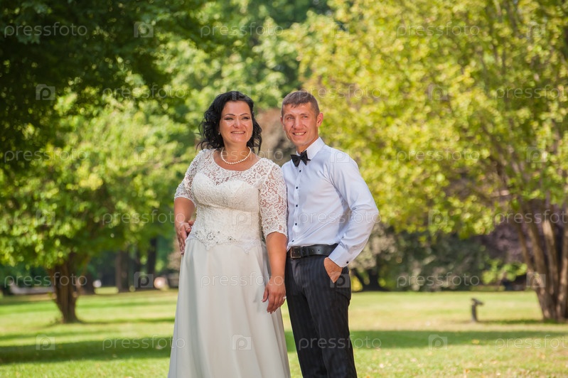 Улыбающиеся и счастливые жених и невеста во время свадебной прогулки на природе