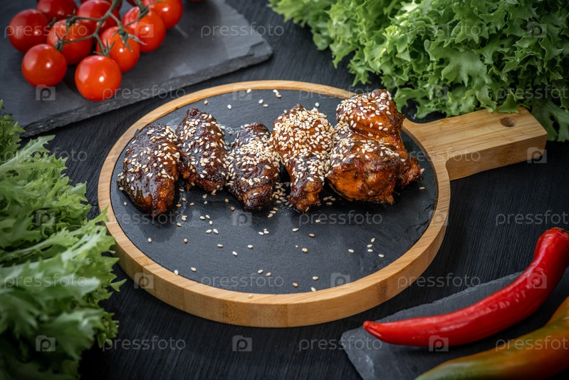 Крылышки барбекю с кунжутом, на каменной тарелке