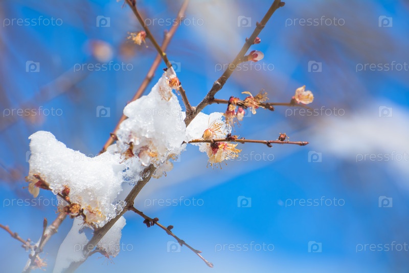 Весенние заморозки, цветущие абрикосы, яблони, под снегом