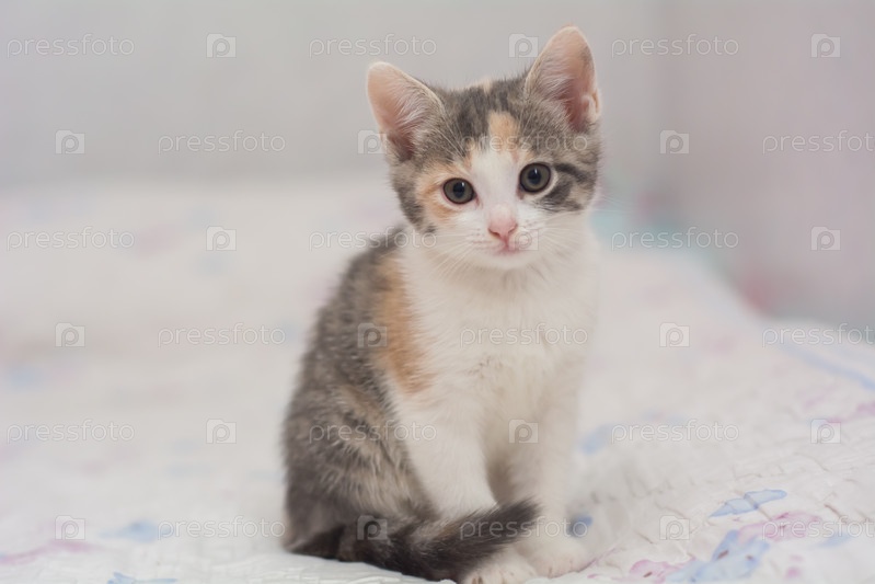 Котенок трехцветный месячный игриво позирует перед камерой