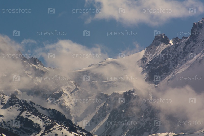 Снежные горные вершины среди облаков, Киргизский хребет, урочище Чонкурчак, страна Кыргызстан. Селективный фокус