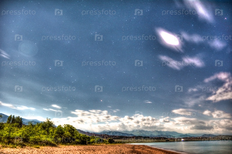 Ночной вид на звезды, горное озеро, выборочный фокус,