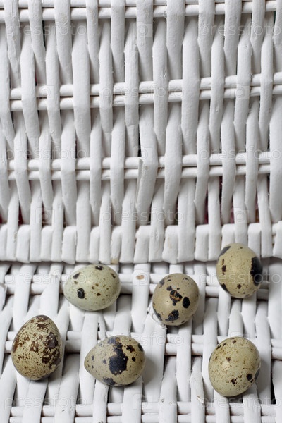 Перепелиные яйца лежат на поверхности плетеной лозы. На белом фоне