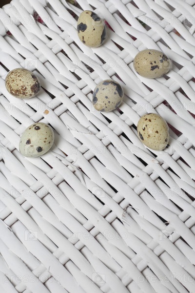 Перепелиные яйца лежат на поверхности плетеной лозы. На белом фоне