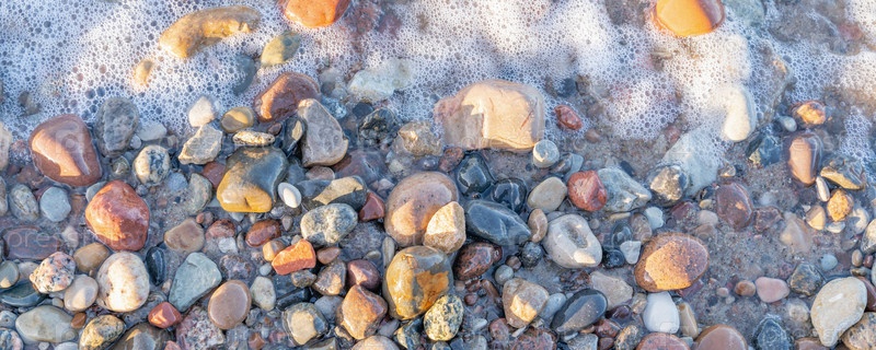 Морская пена на мокрой гальке на пляже в солнечный день, крупным планом