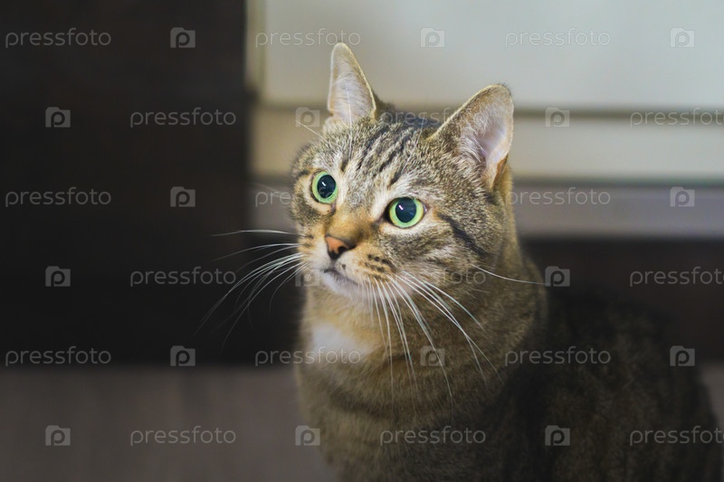 Полосатый кот с большими зелеными глазами сидит на полу