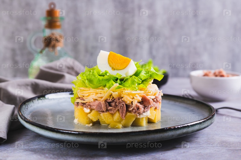 Аппетитный салат из консервированного тунца, картофеля, сыра, салата и яиц на тарелке