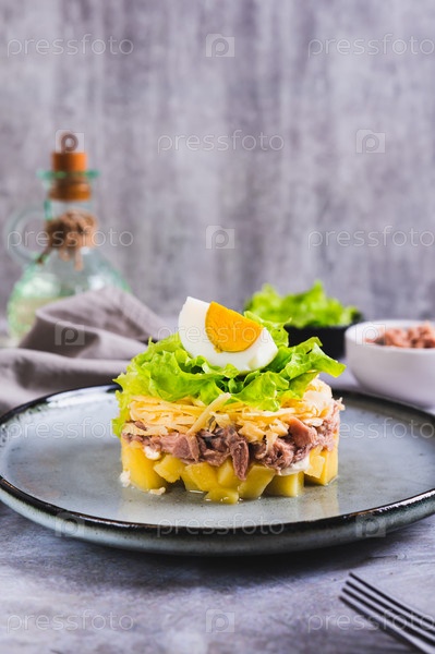 Аппетитный салат из консервированного тунца, картофеля, сыра, салата и яиц на тарелке вертикального вида