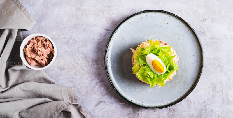 Сытный салат из консервированного тунца с овощами и зеленью на тарелке, вид сверху, веб-баннер