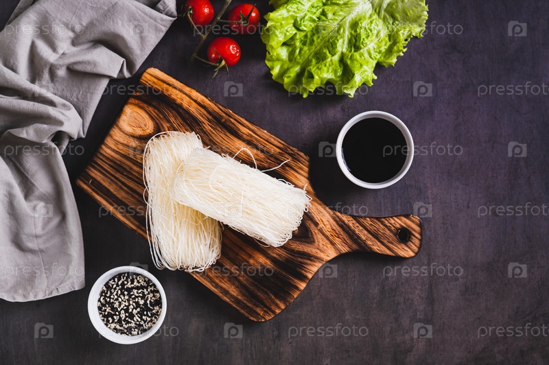 Азиатская сырая рисовая лапша фунчоза на деревянной доске, вид сверху стола