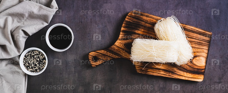 Две порции сухой рисовой лапши фунчозы на доске на столе, вид веб-баннера