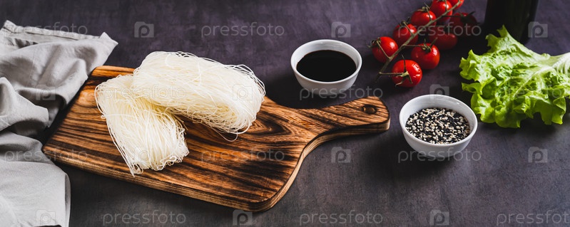 Азиатская сырая рисовая лапша фунчоза на деревянной доске на столе веб-баннер