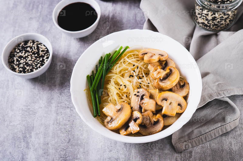 Азиатский суп с рисовой лапшой, грибами и зеленым луком в миске на столе