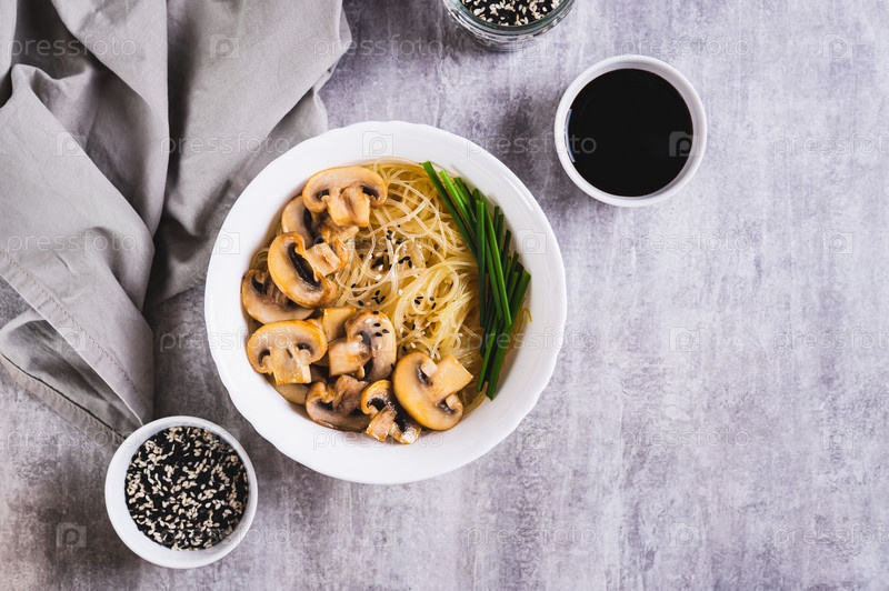 Рисовая лапша фунчоза с грибами и зеленым луком в миске на столе