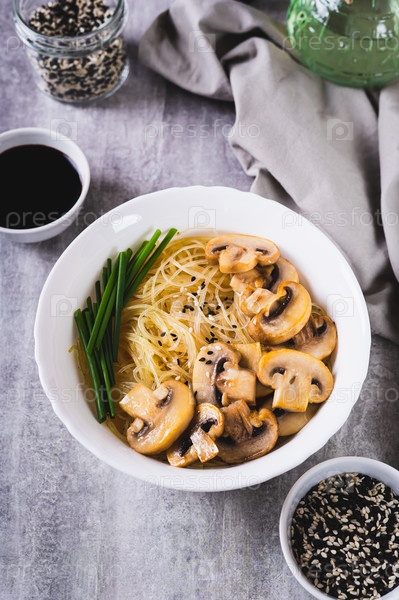 Азиатский суп с рисовой лапшой, грибами и зеленым луком в миске на столе, вертикальный вид