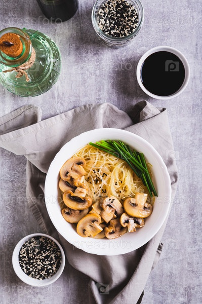 Азиатский суп с рисовой лапшой, грибами и зеленым луком в миске сверху и вертикальный вид