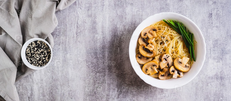 Азиатский суп с рисовой лапшой, грибами и зеленым луком в миске, вид сверху, веб-баннер